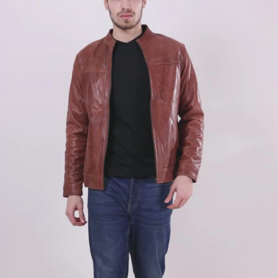 Experience timeless elegance with the Oxford Classic Leather Jacket, crafted from premium full-grain leather in a rich Cognac Brown shade. Designed for a tailored comfort fit, it features a soft satin lining, dual side zipper pockets, and smooth, hand-finished craftsmanship with refined panel detailing. Ideal for everyday style or elevated occasions. Professional leather cleaning recommended.
