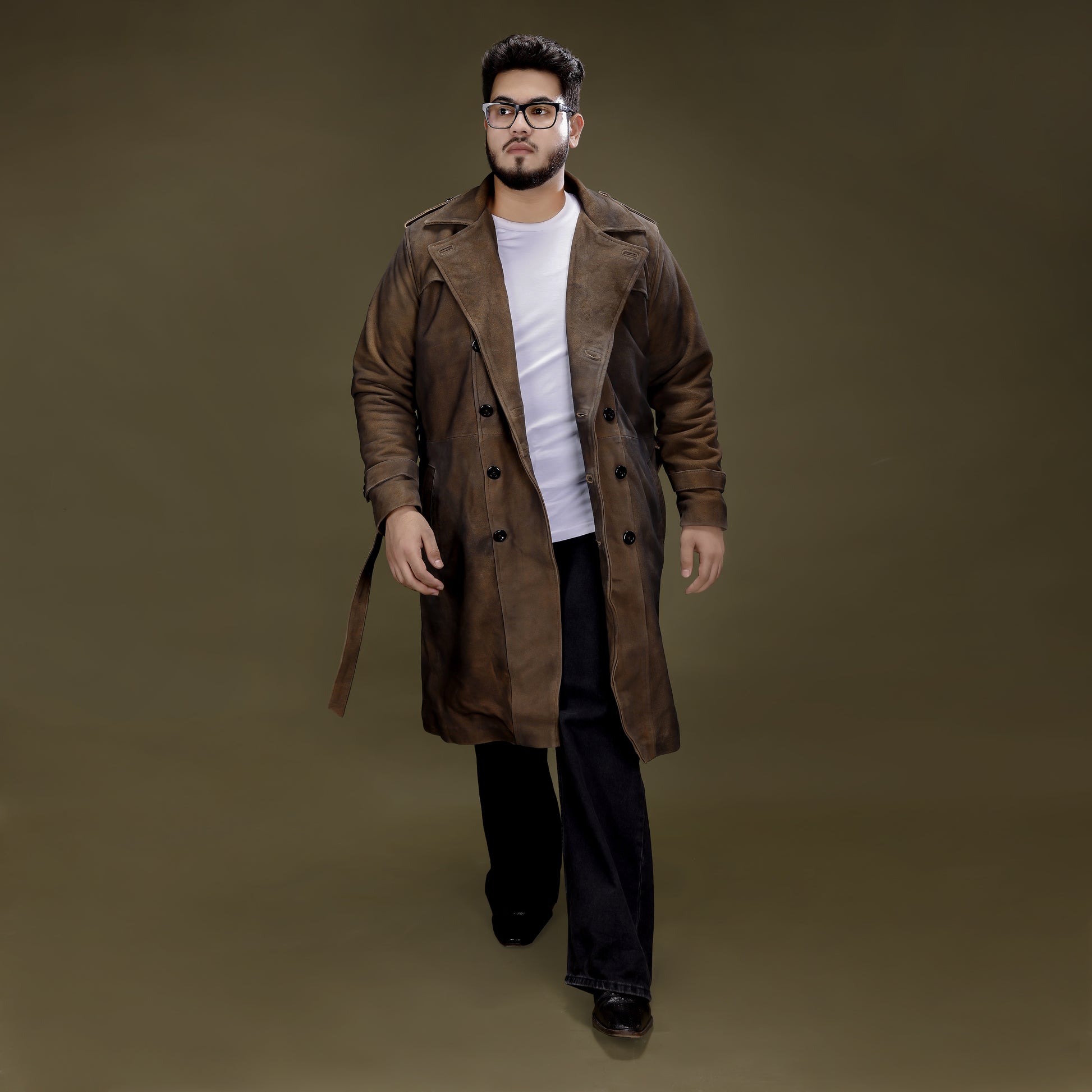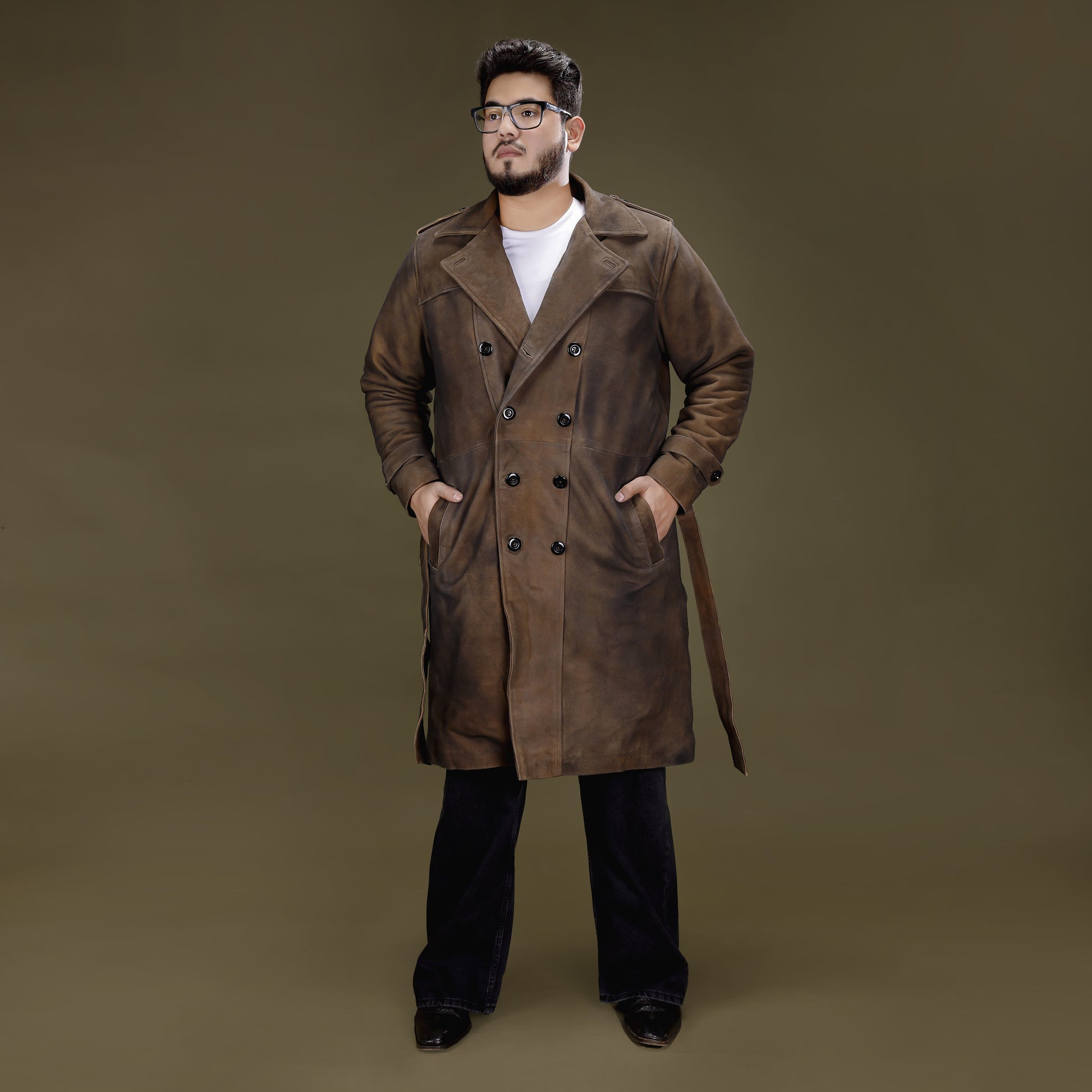 Discover unmatched winter luxury with The Imperial Trench Coat, crafted from ultra-premium heavyweight leather in a rich Vintage Bourbon Brown shade. Designed in a long, structured tailored fit, it features a double-breasted closure, thermal-insulated satin lining, and deep hand-warmer pockets for superior cold-weather comfort. The hand-aged, burnished leather finish adds timeless character. Professional leather treatment recommended.